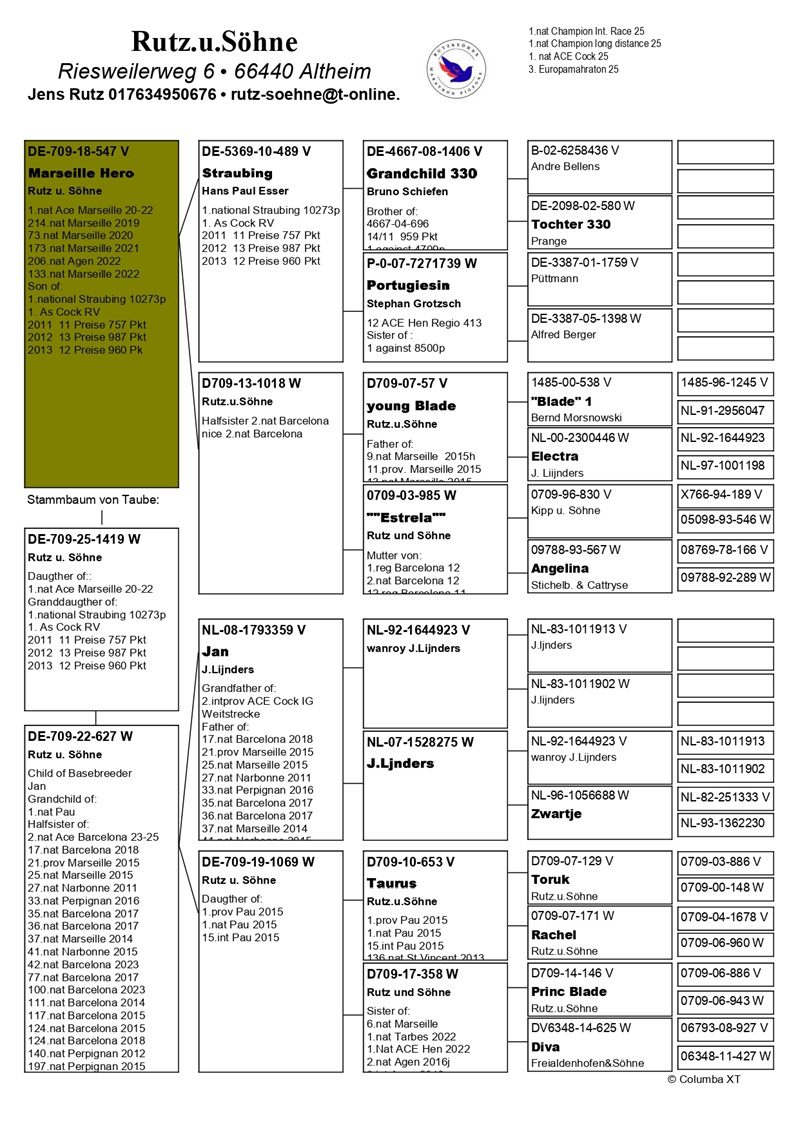 Die Zwillinge Jens und Sven Rutz haben erfolgreich die Staffel von ihrem Vater Karl-Heinz Rutz übernommen und führen die Tradition der Spitzenleistungen auf höchstem Niveau fort. Unter ihrer Führung erzielte die Familie Ergebnisse, die die Erwartungen vieler Züchter übertreffen, und wird von Fachleuten als einer der stärksten Konkurrenten Deutschlands angesehen. Professionalität, Disziplin und bedingungslose Leidenschaft für Brieftauben haben den Status der Familie Rutz in der Elite des europäischen Brieftaubensports gefestigt.