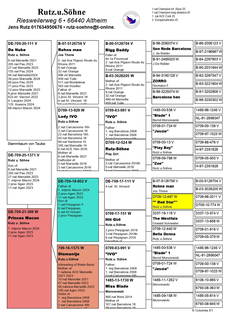 Die Zwillinge Jens und Sven Rutz haben erfolgreich die Staffel von ihrem Vater Karl-Heinz Rutz übernommen und führen die Tradition der Spitzenleistungen auf höchstem Niveau fort. Unter ihrer Führung erzielte die Familie Ergebnisse, die die Erwartungen vieler Züchter übertreffen, und wird von Fachleuten als einer der stärksten Konkurrenten Deutschlands angesehen. Professionalität, Disziplin und bedingungslose Leidenschaft für Brieftauben haben den Status der Familie Rutz in der Elite des europäischen Brieftaubensports gefestigt.