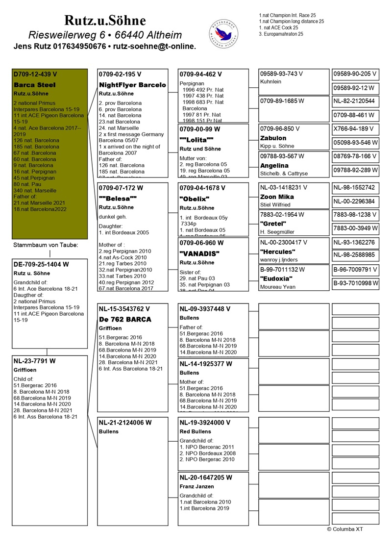 Die Zwillinge Jens und Sven Rutz haben erfolgreich die Staffel von ihrem Vater Karl-Heinz Rutz übernommen und führen die Tradition der Spitzenleistungen auf höchstem Niveau fort. Unter ihrer Führung erzielte die Familie Ergebnisse, die die Erwartungen vieler Züchter übertreffen, und wird von Fachleuten als einer der stärksten Konkurrenten Deutschlands angesehen. Professionalität, Disziplin und bedingungslose Leidenschaft für Brieftauben haben den Status der Familie Rutz in der Elite des europäischen Brieftaubensports gefestigt.