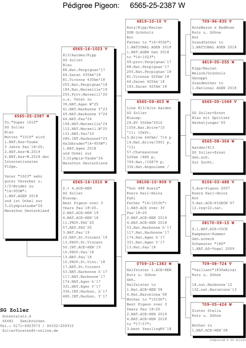 Zoller tritt unter dem Namen SG Zoller an, sowohl bei deutschen Wettbewerben als auch bei internationalen Etappen, und bildet zusammen mit seiner Frau und seiner Tochter ein starkes Team. Ihre Marathon-Taubenlinie stammt aus den traditionellen Jan Aarden-Blutlinien, ergänzt durch Tauben von angesehenen Züchtern wie Kipp, Koers, Rutz und Batenburg.