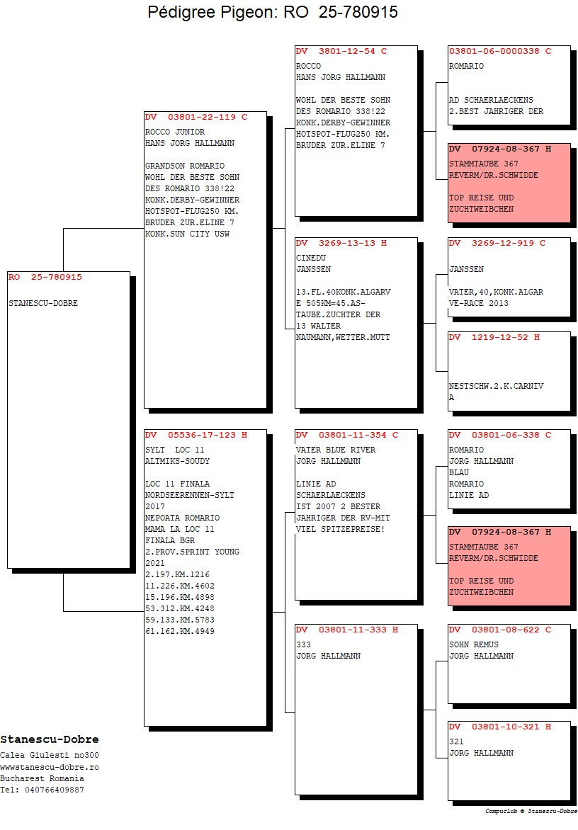 Jede Taube wird mit einem vollständigen Stammbaumoffiziellen Rennergebnissen und Informationen über bereits prämierte Geschwister angeboten. Die Auswahl erfolgt ausschließlich auf Grundlage nachgewiesener Leistung.