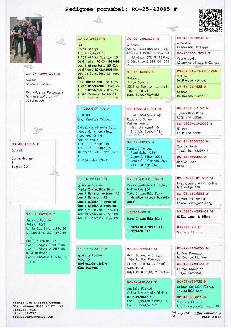 Zusammenfassend ist Ion Stancu weit mehr als ein einfacher Taubenzüchter: Er ist ein Pionier, ein Innovator und eine lebende Legende der rumänischen Brieftaubenzucht. Durch seine unermüdliche Arbeit, die hohen Standards, die er gesetzt hat, und die Eleganz, mit der er jeden Wettbewerb in eine Lektion der Meisterschaft verwandelt, schreibt er weiterhin Geschichte und steigert das Ansehen dieses edlen Sports.