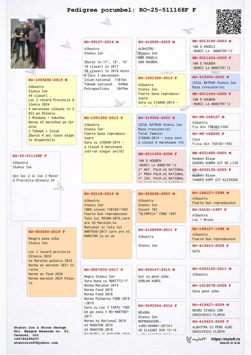 Zusammenfassend ist Ion Stancu weit mehr als ein einfacher Taubenzüchter: Er ist ein Pionier, ein Innovator und eine lebende Legende der rumänischen Brieftaubenzucht. Durch seine unermüdliche Arbeit, die hohen Standards, die er gesetzt hat, und die Eleganz, mit der er jeden Wettbewerb in eine Lektion der Meisterschaft verwandelt, schreibt er weiterhin Geschichte und steigert das Ansehen dieses edlen Sports.