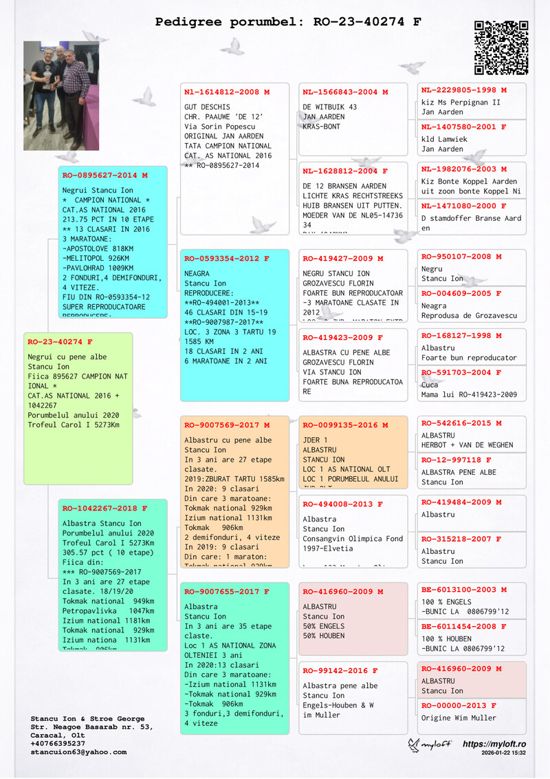 Zusammenfassend ist Ion Stancu weit mehr als ein einfacher Taubenzüchter: Er ist ein Pionier, ein Innovator und eine lebende Legende der rumänischen Brieftaubenzucht. Durch seine unermüdliche Arbeit, die hohen Standards, die er gesetzt hat, und die Eleganz, mit der er jeden Wettbewerb in eine Lektion der Meisterschaft verwandelt, schreibt er weiterhin Geschichte und steigert das Ansehen dieses edlen Sports.