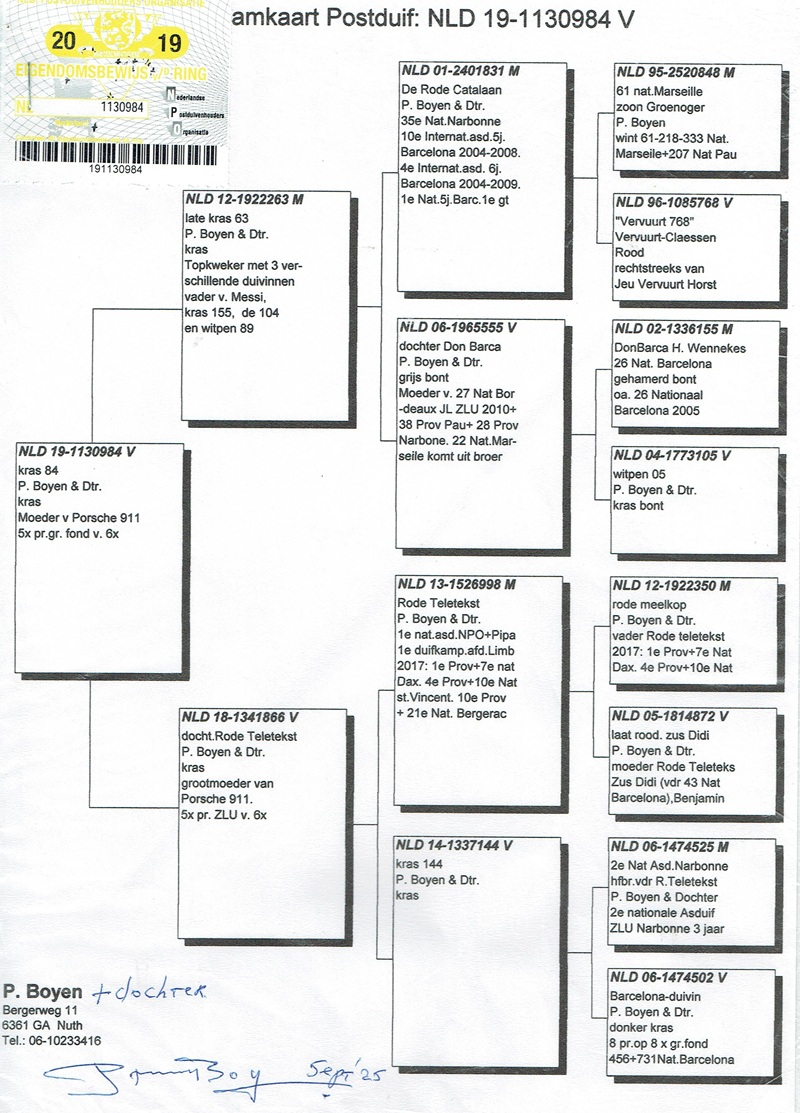 In der Marathon-Brieftaubenzucht gibt es Zuchten, die nicht durch Masse beeindrucken, sondern durch Konstanz, Widerstandskraft und Jahr für Jahr erzielte Spitzenleistungen auf den härtesten Strecken Europas. Piet Boyen & Tochter steht genau für diese Schule der Exzellenz: ein kleiner, aber außergewöhnlich wertvoller Bestand, geformt durch kompromisslose Selektion und eine klare genetische Vision, die von Generation zu Generation weitergegeben wird.