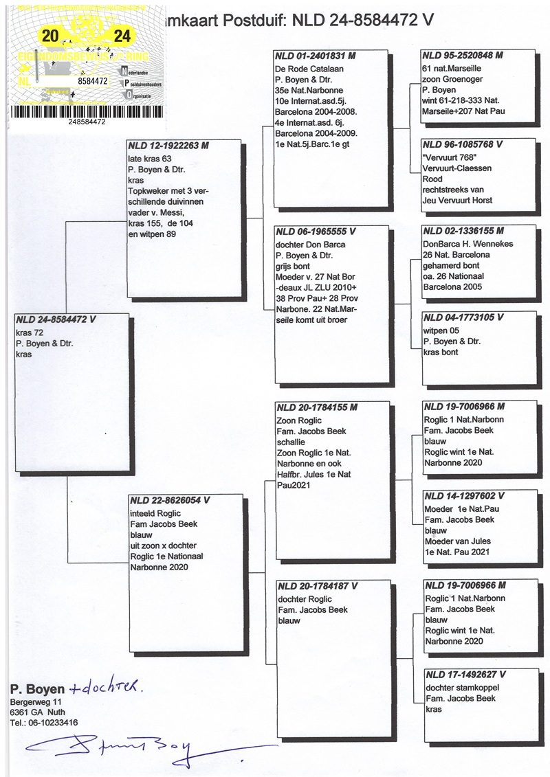In der Marathon-Brieftaubenzucht gibt es Zuchten, die nicht durch Masse beeindrucken, sondern durch Konstanz, Widerstandskraft und Jahr für Jahr erzielte Spitzenleistungen auf den härtesten Strecken Europas. Piet Boyen & Tochter steht genau für diese Schule der Exzellenz: ein kleiner, aber außergewöhnlich wertvoller Bestand, geformt durch kompromisslose Selektion und eine klare genetische Vision, die von Generation zu Generation weitergegeben wird.