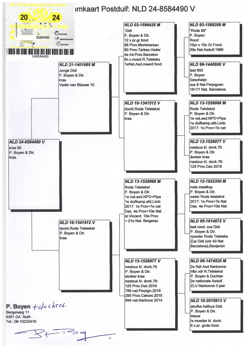 Unter dem Namen Piet Boyen & Tochter, aktiv seit 2002 im elterlichen Schlag in Nuth, führt Piet Boyen eine von seinem Vater begründete Tradition fort. Nach einer Phase eigenständiger Teilnahme in Schimmert, mit ausschließlicher Ausrichtung auf den großen Marathon, folgte eine legendäre Vater–Sohn-Zusammenarbeit. Diese führte zu wiederholten Spitzenplatzierungen in den nationalen Fondspiegel-Ranglisten und gipfelte in Platz 1 in den Jahren 1996–1998. Aus Respekt vor seinem im Jahr 2002 verstorbenen Vater behielt Piet den Namen der Zucht bei und machte sie zu einem Maßstab des niederländischen Marathonfluges.