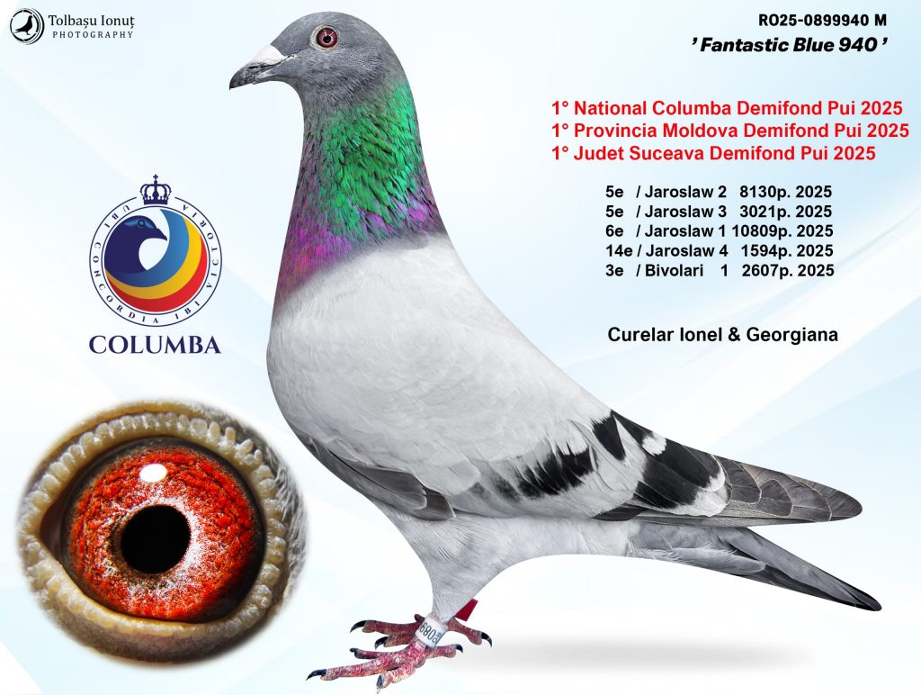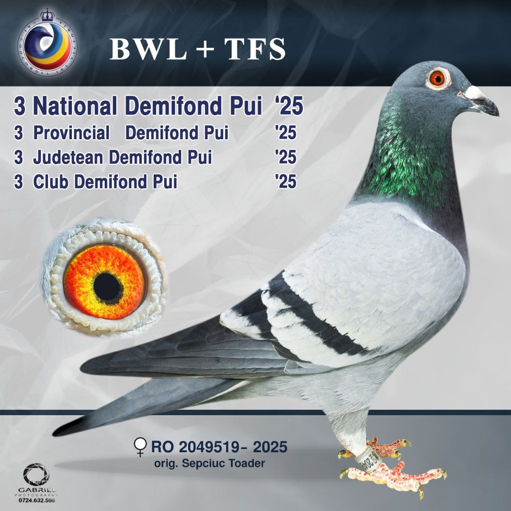 Starting with the 2024 season, Toader Sepciuc from Volovăț has been racing in combination with his close friend Liviu Bodnar, under the team name “BWL + TFS”. Although their initial goal was to select the youngsters, entering them in the middle distance races brought them a national trophy: 3rd place National Middle Distance Young Birds. The performance was achieved by the hen RO-2025-2049519, which accumulated 31 penalty points in the four Jarosław races. Her best result was a 3rd place out of 2,341 pigeons.
