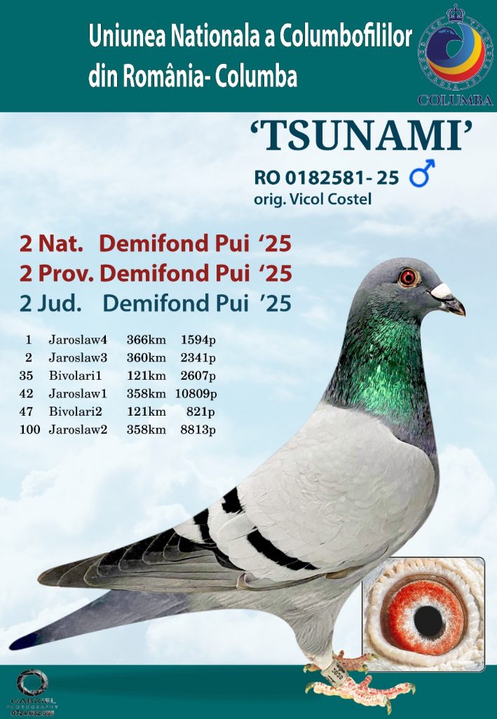 Second place at national level was claimed by Costel Vicol from Volovăț with the youngster RO-2025-0182581, who completed the norm with 16.72 penalty points. In fact, the vice-champion secured most of his result in the last two races, where he achieved a 1st place on release (1,594 pigeons) and a 2nd place on zone (2,341 pigeons), accumulating only 1.48 points from the total coefficient. The other two rankings were: 42nd place out of 10,809 pigeons and 100th place out of 8,813 pigeons, at distances between 358 and 366 km.