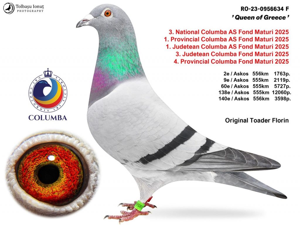 In 2025, Florin Toader decided to compete exclusively on the Bulgaria–Greece route, giving up participation on the Poland route. The decision proved inspired, as the fancier from Prahova achieved several important national rankings, including 3rd National Ace Long Distance (Old Birds). The hen RO-2023-0956634 secured this result after achieving a total of 66.21 penalty points in the five long-distance races from Askos (Greece – 555 km), a route that places additional demands on orientation and endurance.