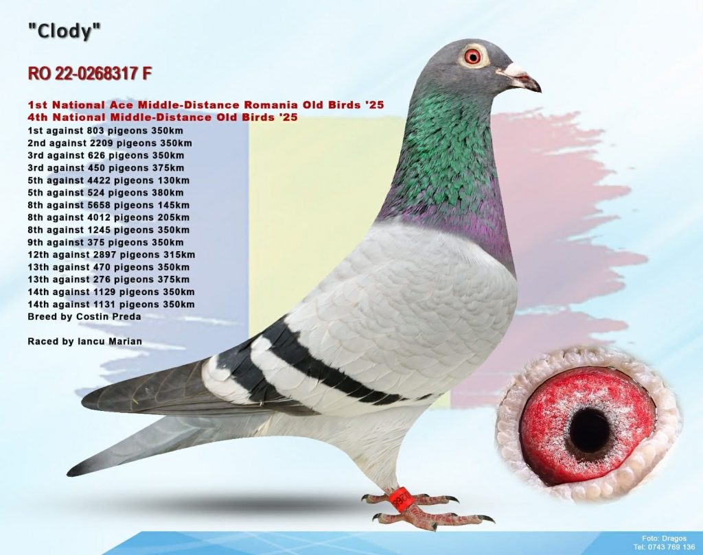 His champion hen is RO-2022-0268317, which completed the norm with an exceptional coefficient of 80.35 penalty points, over 60 points ahead of the second-ranked pigeon. She clocked seven middle-distance races, all released from Hârlău (Iași County), over a distance of 349 km.