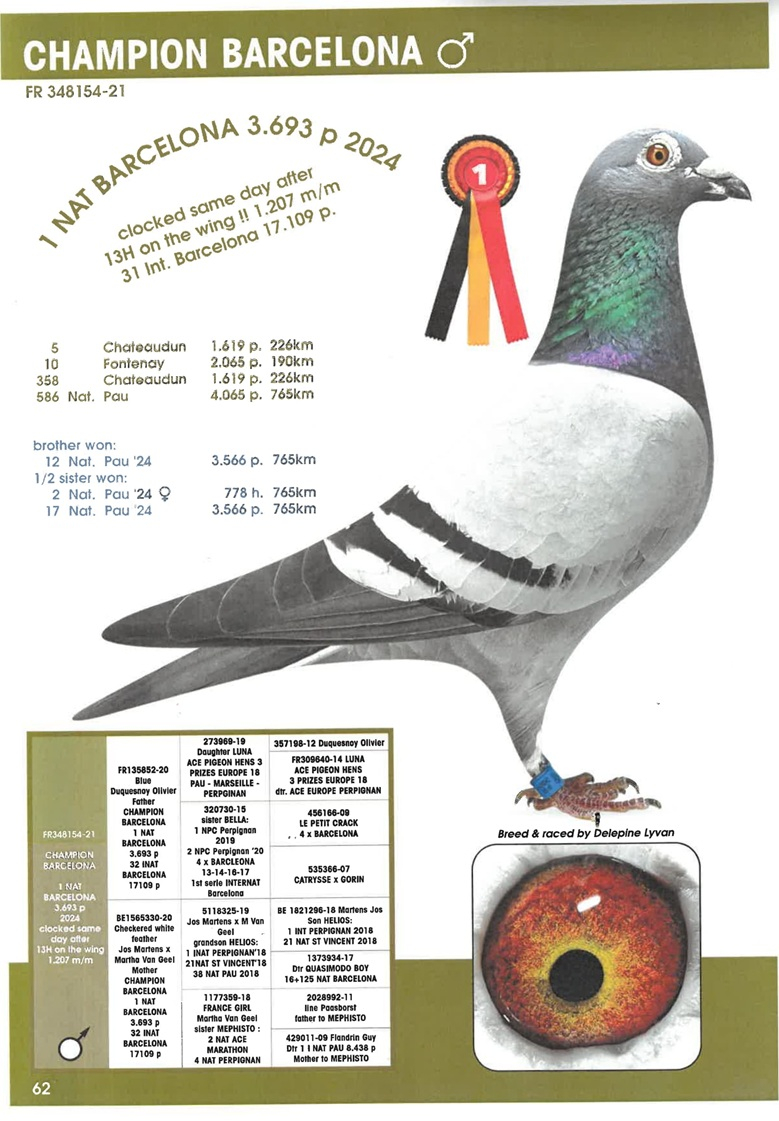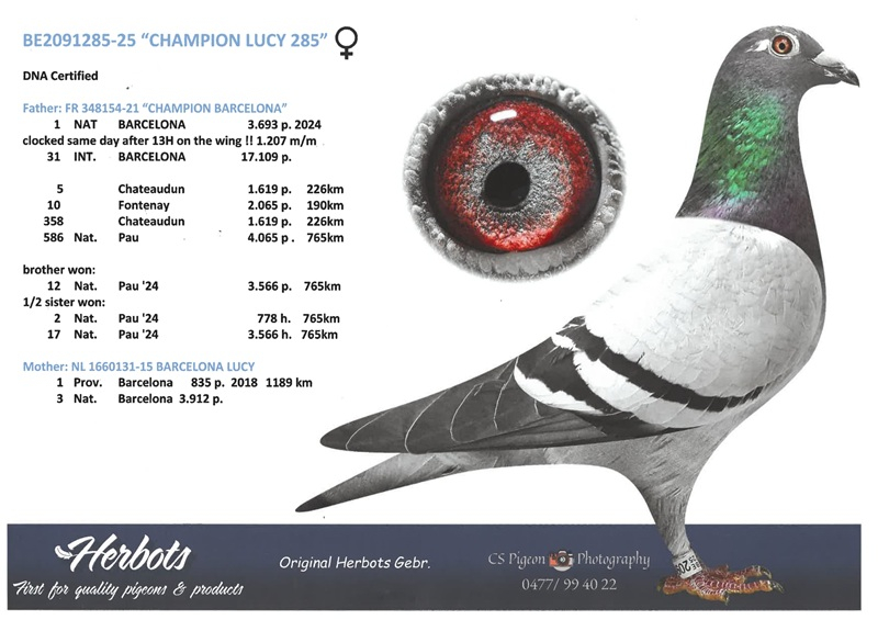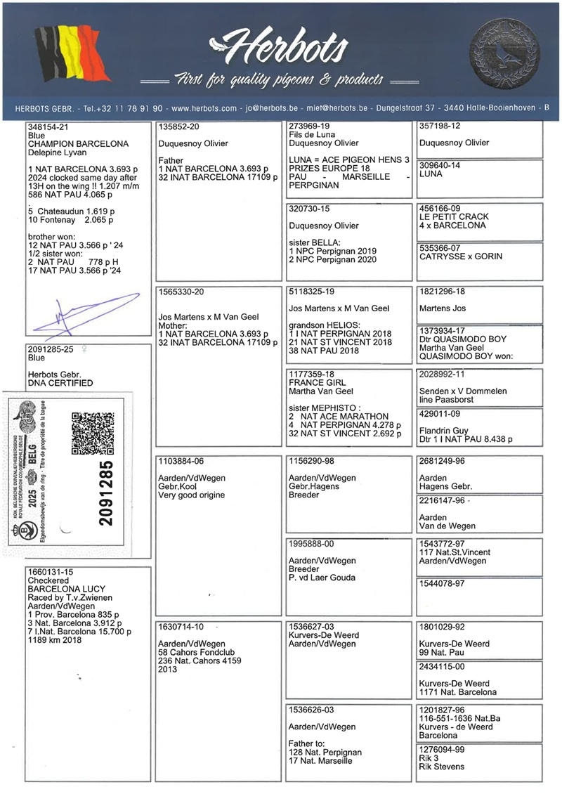 In this superb auction, Herbots offers a lot of inestimable value, consisting of direct offspring of these legendary winners. In the pedigree of every pigeon offered, you will find 2, 3, or even 4 Barcelona winners—an exceptionally rare guarantee of supreme genetic quality.