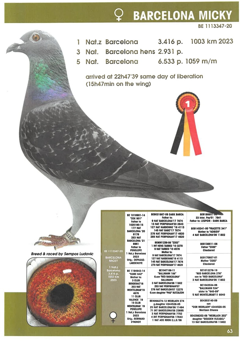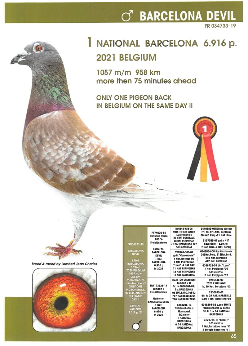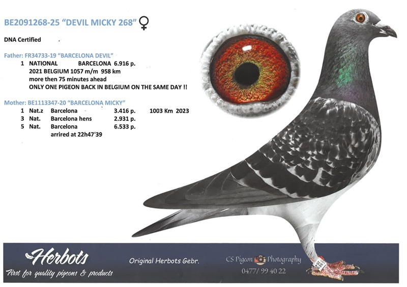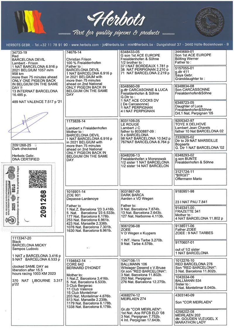In this superb auction, Herbots offers a lot of inestimable value, consisting of direct offspring of these legendary winners. In the pedigree of every pigeon offered, you will find 2, 3, or even 4 Barcelona winners—an exceptionally rare guarantee of supreme genetic quality.