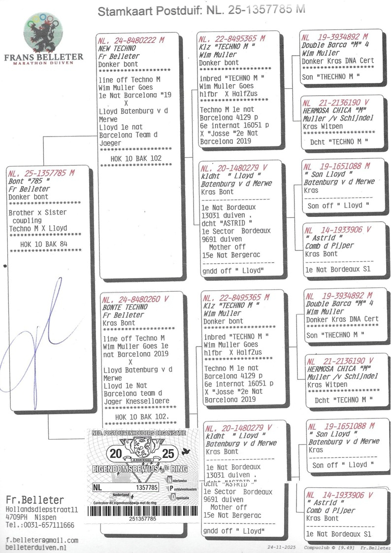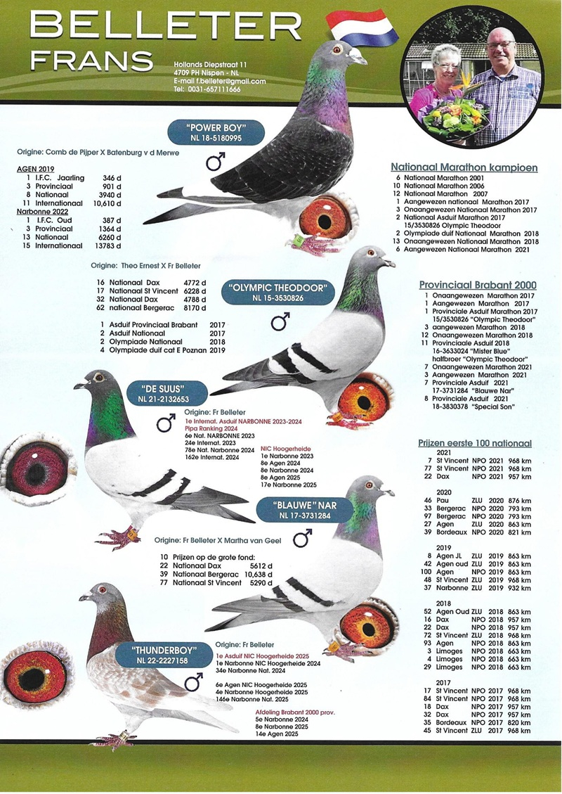 Frans Belleter is one of the most respected names in Dutch and European pigeon sport, renowned for consistent, high-level performances in long-distance and extreme marathon races. Together with José Belleter, he has transformed their loft in Nispen, the Netherlands, into a benchmark for elite marathon competition, founded on strict selection and exclusive testing under the toughest racing conditions.