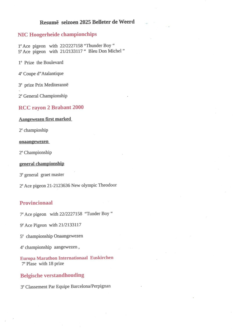 The Belleter philosophy is based on uncompromising selection, retaining only pigeons that repeatedly demonstrate superior physical endurance, reliable orientation, and strong competitive character. Their pigeons are specialized for extreme distances exceeding 1,000 km and are widely recognized for their exceptional homing instinct and rapid recovery ability. Belleter bloodlines are highly valued across Europe and are successfully used as foundation stock in many top lofts, both for racing and breeding, consistently transmitting the essential qualities required for marathon racing.