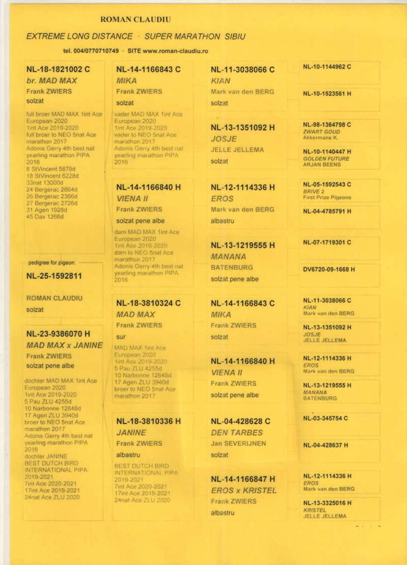 This auction represents a rare opportunity to acquire top-tier, tested, and certified genetic material, coming directly from the loft of a distinguished Romanian fancier, recognized for his professionalism and international reputation.