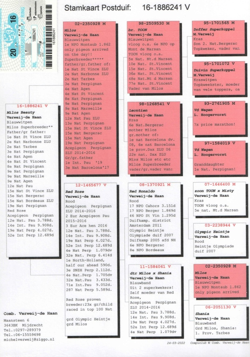 These pigeons descend from prestigious bloodlines – Van der Wegen, De Heijde, Hagens, and Belleter – families composed of birds with proven performances, carefully selected, flight-tested, and prepared for the elite marathon races of the coming seasons (Bordeaux 2025, Barcelona 2026).