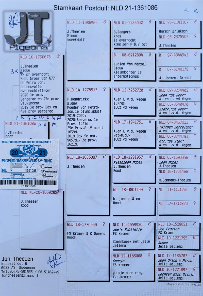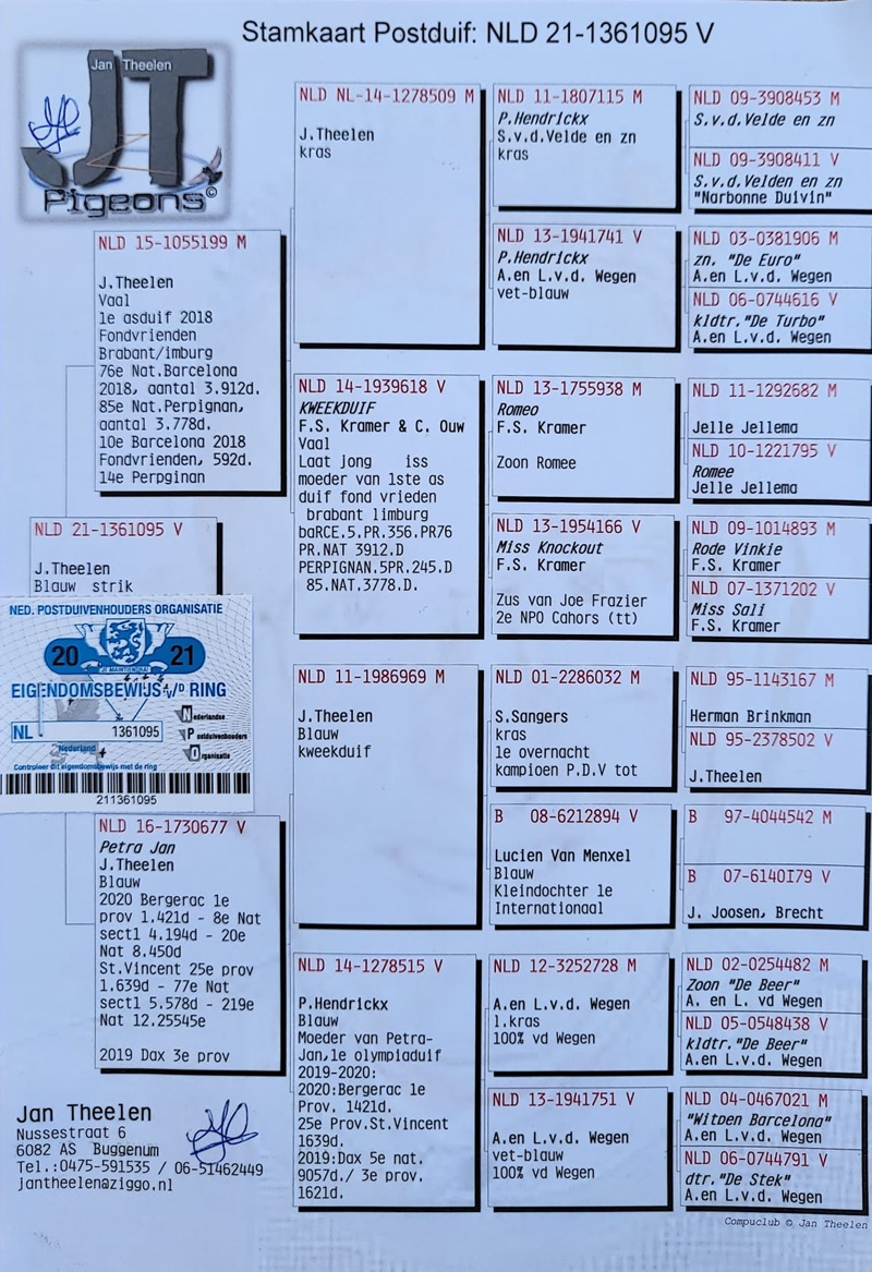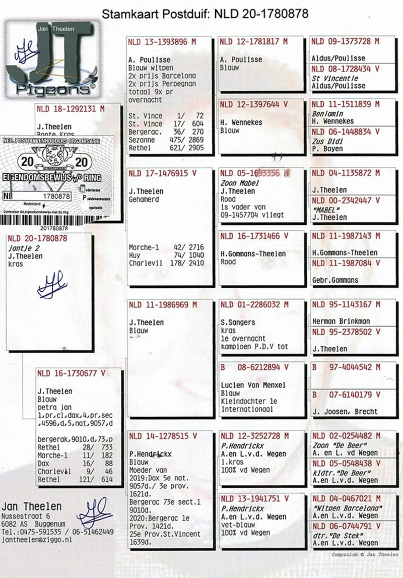 These pigeons descend from prestigious bloodlines – Van der Wegen, De Heijde, Hagens, and Belleter – families composed of birds with proven performances, carefully selected, flight-tested, and prepared for the elite marathon races of the coming seasons (Bordeaux 2025, Barcelona 2026).