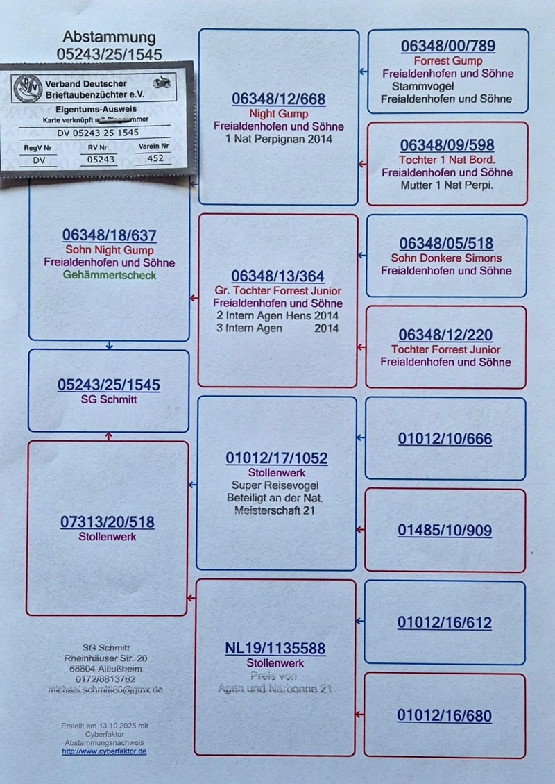 After switching to a long-distance racing program in 2019, SG Schmitt quickly established itself at both national and international level, achieving Top Ten rankings in Germany in 2024 and 2025, with an arrival rate of approximately 50% and numerous top positions. These pigeons stand out for their consistency, reliability in returning home, and long-term endurance, making them valuable both for racing and as breeding material.