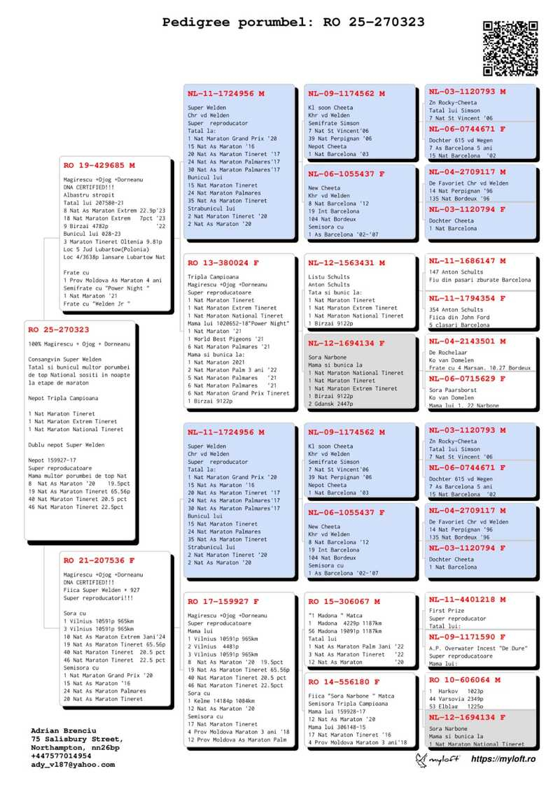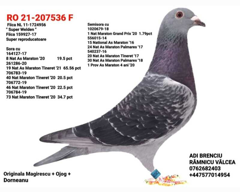 The genetic quality of pigeons bred by Adrian Brenciu is also confirmed by the outstanding results achieved by other renowned fanciers who have introduced his bloodlines into their lofts: