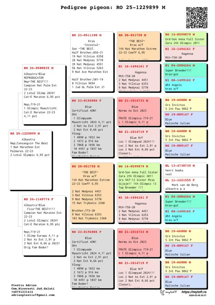 The value and consistency of his results were further confirmed by the award of Breeder of the Year 2023 in the Extreme category, with a total of only 54.76 penalty points, a performance that placed him at the top of the national rankings. In addition, he proved his competitiveness and exceptional endurance in Romania’s long-distance races, achieving notable results at Vilnius National, one of the most demanding marathon competitions, where his pigeons demonstrated impressive consistency and resilience.