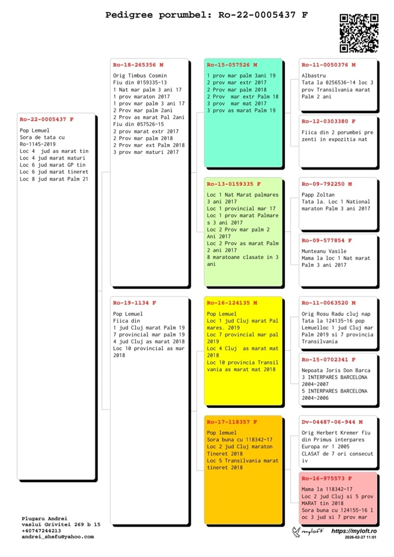 My name is Plugaru Andrei and I live in Vaslui, Vaslui County. I have been active as a pigeon fancier since 2010 as a member of the Vaslui branch, the year when results also began to appear (1st place Ace Long Distance, 3rd place Long Distance, 4th place Grand Long Distance, 21st place Marathon, and in 2012 the same pigeon achieved 2nd place Vaslui County Berlin National 1217 km). I am passionate about breeding long-distance, marathon and extreme marathon pigeons, an activity that has offered me many satisfactions and personal achievements over time, managing to remain every year at least in the county top 3. At the beginning I focused on long-distance races, later directing my selection and breeding towards marathon and extreme marathon, investing in established bloodlines from various breeders from Romania (Henning Family, Miron Daniel, Butucanu Stefan, Cordeanu Vasile, Fildan Vlad, as well as from abroad. Below I present some of the results achieved in the year 2025: