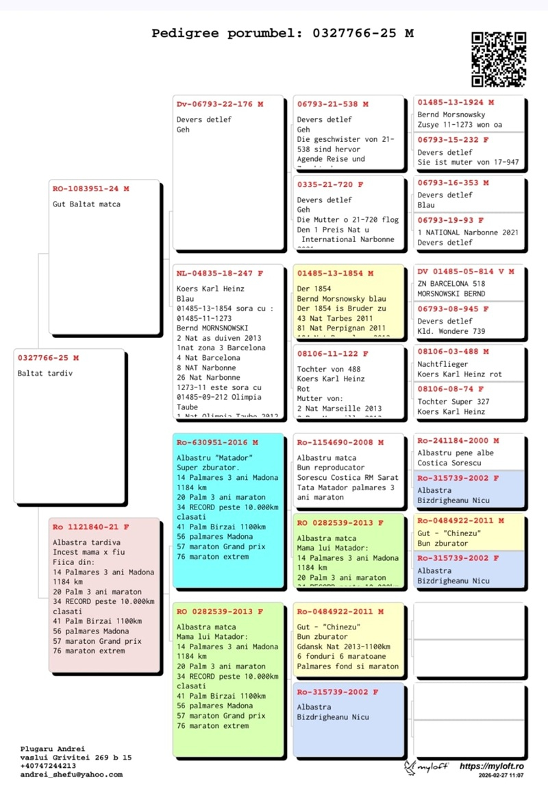 My name is Plugaru Andrei and I live in Vaslui, Vaslui County. I have been active as a pigeon fancier since 2010 as a member of the Vaslui branch, the year when results also began to appear (1st place Ace Long Distance, 3rd place Long Distance, 4th place Grand Long Distance, 21st place Marathon, and in 2012 the same pigeon achieved 2nd place Vaslui County Berlin National 1217 km). I am passionate about breeding long-distance, marathon and extreme marathon pigeons, an activity that has offered me many satisfactions and personal achievements over time, managing to remain every year at least in the county top 3. At the beginning I focused on long-distance races, later directing my selection and breeding towards marathon and extreme marathon, investing in established bloodlines from various breeders from Romania (Henning Family, Miron Daniel, Butucanu Stefan, Cordeanu Vasile, Fildan Vlad, as well as from abroad. Below I present some of the results achieved in the year 2025: