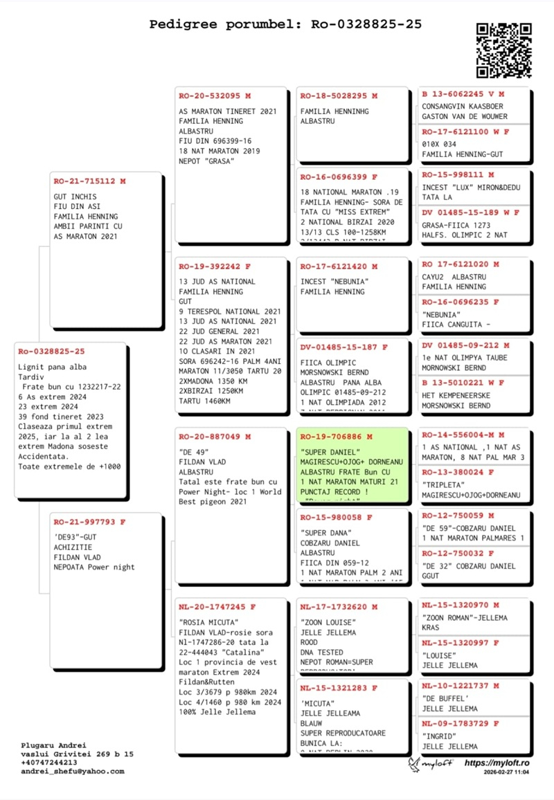 My name is Plugaru Andrei and I live in Vaslui, Vaslui County. I have been active as a pigeon fancier since 2010 as a member of the Vaslui branch, the year when results also began to appear (1st place Ace Long Distance, 3rd place Long Distance, 4th place Grand Long Distance, 21st place Marathon, and in 2012 the same pigeon achieved 2nd place Vaslui County Berlin National 1217 km). I am passionate about breeding long-distance, marathon and extreme marathon pigeons, an activity that has offered me many satisfactions and personal achievements over time, managing to remain every year at least in the county top 3. At the beginning I focused on long-distance races, later directing my selection and breeding towards marathon and extreme marathon, investing in established bloodlines from various breeders from Romania (Henning Family, Miron Daniel, Butucanu Stefan, Cordeanu Vasile, Fildan Vlad, as well as from abroad. Below I present some of the results achieved in the year 2025: