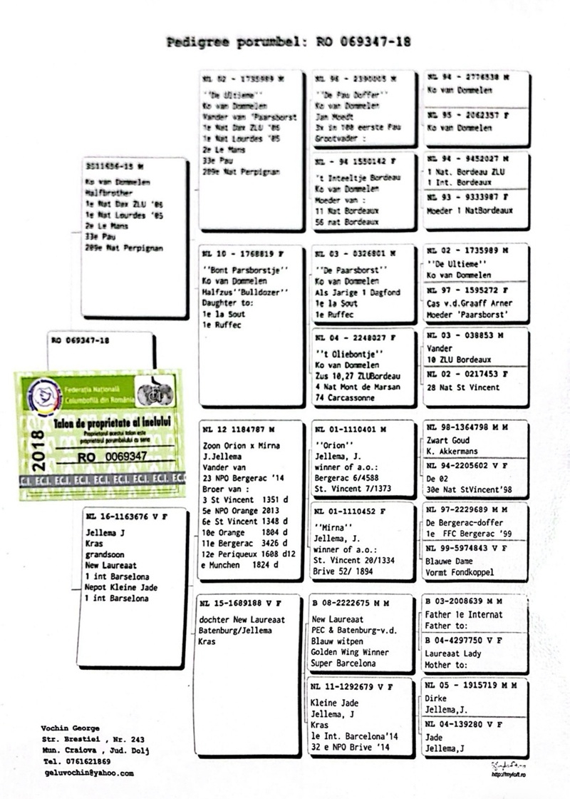 In his acquisitions, Mr. Sorin includes youngsters directly from the most prestigious names in Romania, as well as from the avian elite of Europe. His breeding stock comprises pigeons from internationally renowned breeders such as Gerard Schalwijk, Jelle Jellema, Kipp und Sohne, Cor de Heijde, Magirescu + Ojog + Dorneanu, among others. In this auction, you will find descendants from elite lines such as New Laureaat, Kleine Jade, Special One, Zwart Goud, Orange Oil, Barcelona King, Golden Glory, and many more.