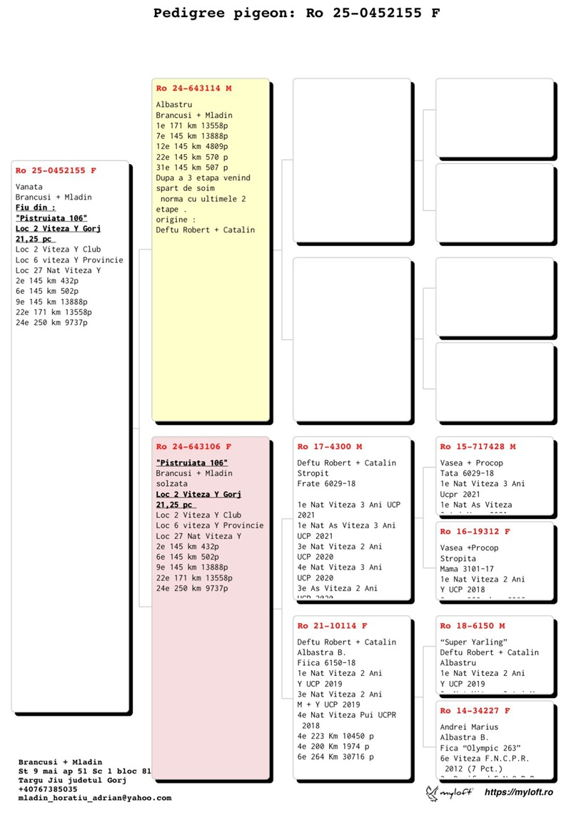 Through these achievements, the Brâncuși–Mladin tandem has not only consolidated the reputation of excellence of their loft but has also become a symbol of professionalism and dedication in pigeon racing. Their work serves as a source of inspiration for both young breeders and experienced enthusiasts, encouraging the pursuit of performance, perseverance, and continuous development in competitive pigeon sport.