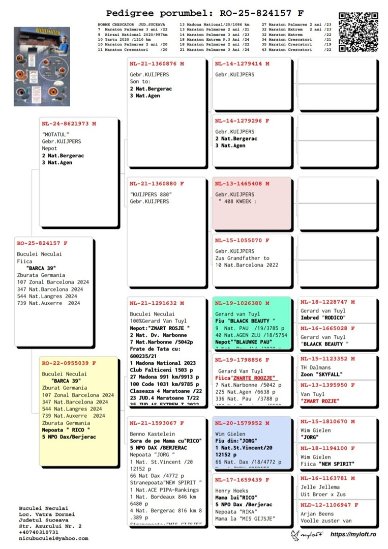Thus, Mr. Buculei's efforts to source top genetic material from across Europe and Romania demonstrate not only a strategic approach but also a profound passion for pigeon racing. In an increasingly demanding competitive landscape, Mr. Buculei stands out for his innovation, perseverance, and a deep understanding of the factors that contribute to success in marathon races. Considering these aspects, it is no surprise that he is regarded as a leader in his field and a model for other breeders who aspire to excellence in this sport.