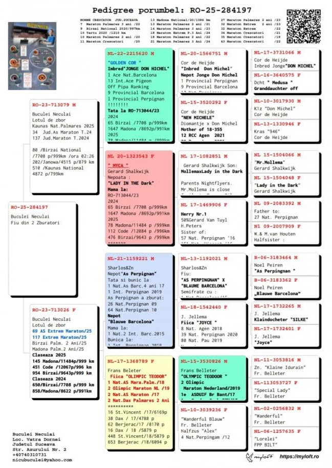 Thus, Mr. Buculei's efforts to source top genetic material from across Europe and Romania demonstrate not only a strategic approach but also a profound passion for pigeon racing. In an increasingly demanding competitive landscape, Mr. Buculei stands out for his innovation, perseverance, and a deep understanding of the factors that contribute to success in marathon races. Considering these aspects, it is no surprise that he is regarded as a leader in his field and a model for other breeders who aspire to excellence in this sport.