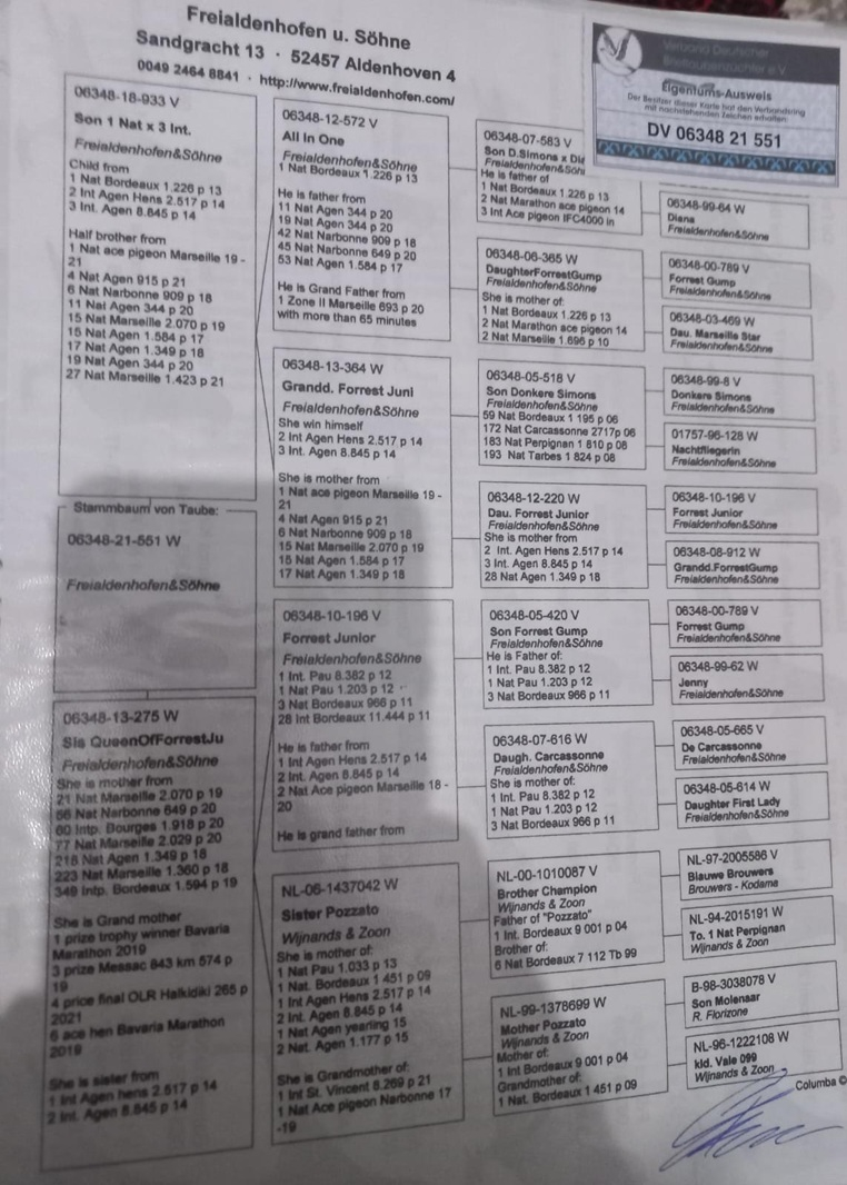 His breeding loft includes pigeons from elite breeders, recognized for their contribution to the development of pigeon racing worldwide. Among these breeders are Gerard Schalwijk, Gerard Van Tuyl, Cees Nijdeken, Sharlos, Frans Beleter, Frank Zwiers, Peter de Han, Win Gielen, Kipp und Söhne, Fraialdelhofen & Son, Etienne Mairlaen, FS. Kramer, and from Romania, prestigious breeders such as Magirescu, Ojog Dorneanu, the Aparaschivei Brothers, the Bodor Family, the Pristavu Family, Roman Claudiu, and Burciu Daniel.