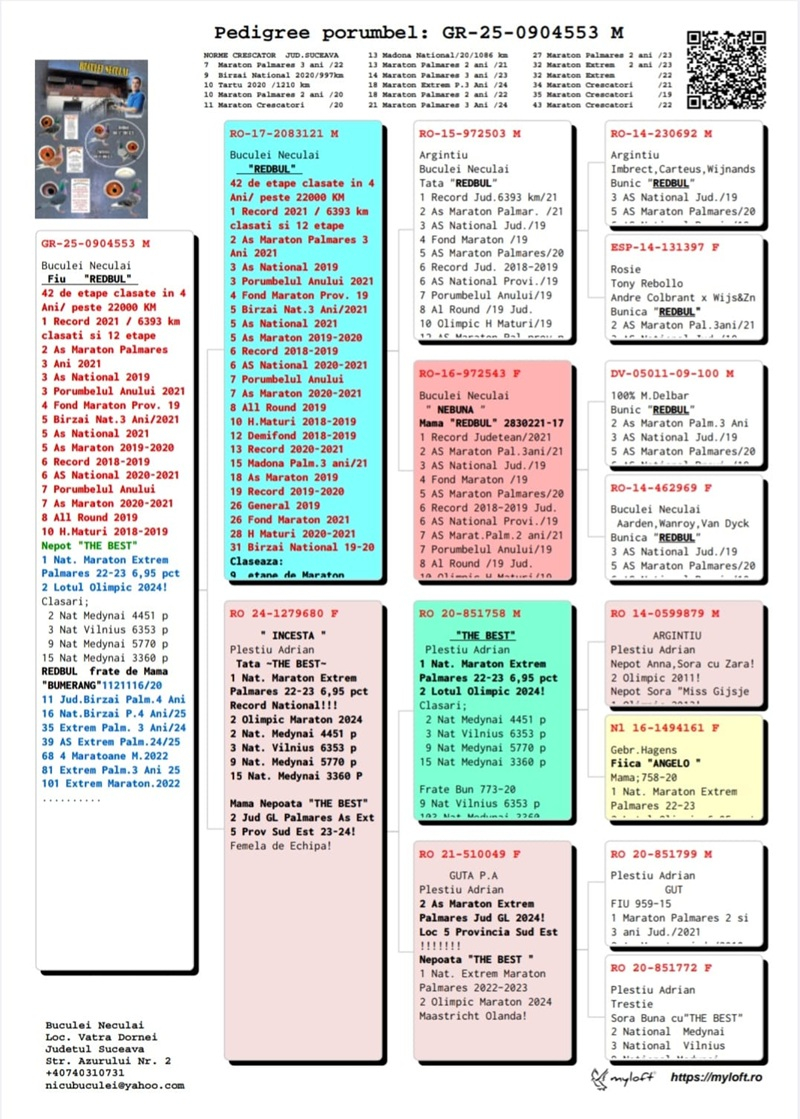 Thus, Mr. Buculei's efforts to source top genetic material from across Europe and Romania demonstrate not only a strategic approach but also a profound passion for pigeon racing. In an increasingly demanding competitive landscape, Mr. Buculei stands out for his innovation, perseverance, and a deep understanding of the factors that contribute to success in marathon races. Considering these aspects, it is no surprise that he is regarded as a leader in his field and a model for other breeders who aspire to excellence in this sport.