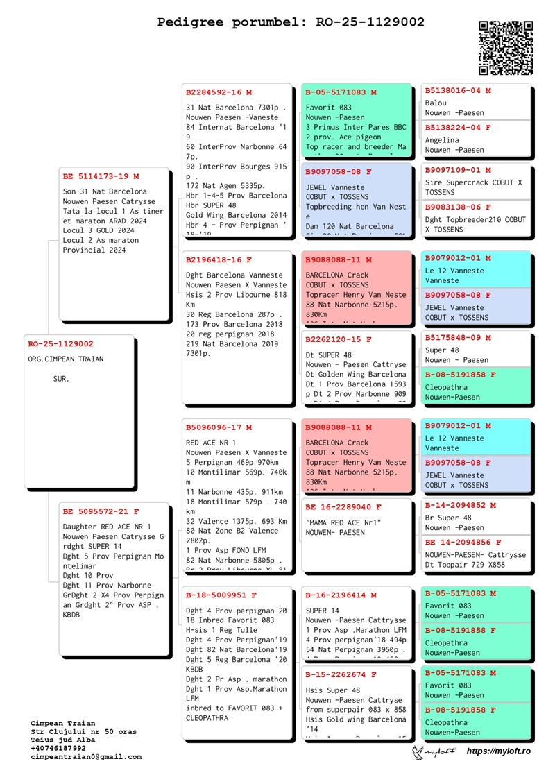 Traian Cîmpean stands out as a dedicated breeder with profound knowledge of pigeon racing, which enables him to practice this discipline at the highest standards of performance. From the very beginning of his career, he understood that success must be built upon a superior breeding foundation, and the results obtained in time have validated this vision. His breeding loft has been strengthened through the careful integration of pigeons from renowned Romanian fanciers, as well as from valuable genetic lines originating in Western Europe.