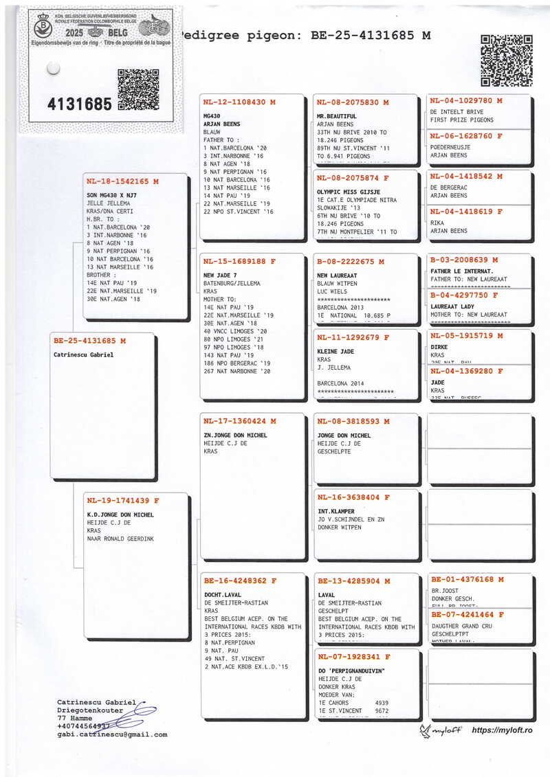 Gabriel Catrinescu does not offer promises – he offers continuity in excellence. For those who seek authentic quality and proven performance, this auction stands as a discreet yet firm invitation to the very essence of modern pigeon sport – where true value is confirmed in flight.
