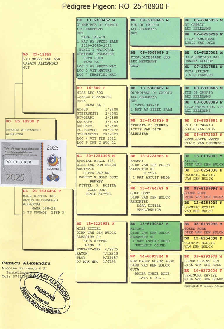 With an impressive base of over 350 breeders, including 100 specialized in marathon races, Cazacu manages one of the most well-organized lofts in the country. His birds descend from renowned European bloodlines — Koopman, Vandenabeele, Van den Bulck, Heremans, Hooymans, Jelle Jellema, Cor de Heijde, Pollin, Hebberecht, Vandenheede, among others — all rigorously selected for their performance potential in each racing category.