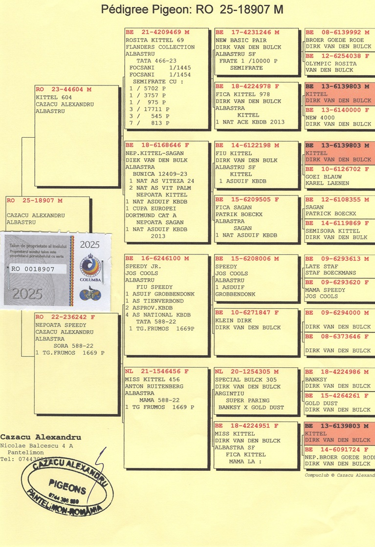 With an impressive base of over 350 breeders, including 100 specialized in marathon races, Cazacu manages one of the most well-organized lofts in the country. His birds descend from renowned European bloodlines — Koopman, Vandenabeele, Van den Bulck, Heremans, Hooymans, Jelle Jellema, Cor de Heijde, Pollin, Hebberecht, Vandenheede, among others — all rigorously selected for their performance potential in each racing category.