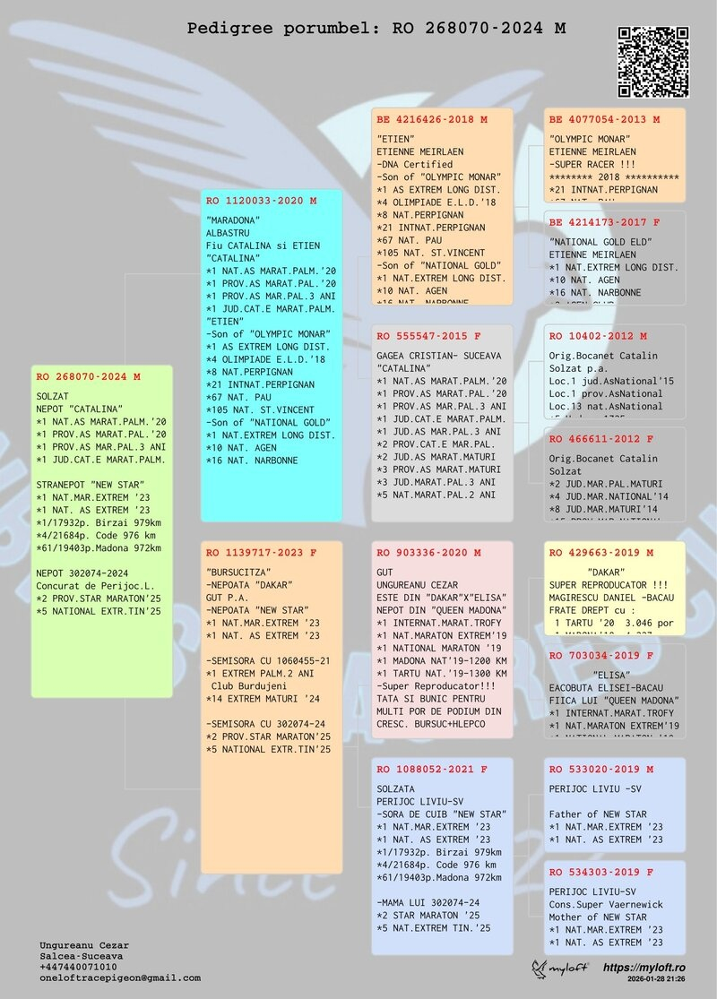 By combining top-quality genetic material with a methodical and professional approach to loft management, Cezar Ungureanu positions himself as a strong contender for further top-level results in the future. His dedication, perseverance, and genuine passion make him a benchmark of excellence in pigeon sport in Suceava County and, implicitly, on the national stage.