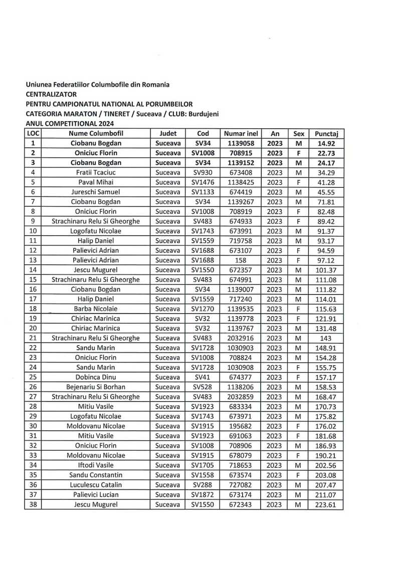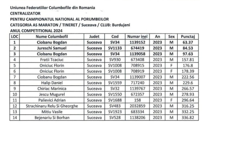 His achievements in competitions reflect a professional and consistent vision. Over the years, the breeder from Siminicea has achieved multiple Top 10 National rankings in the Marathon and Long-Distance categories, won 1st place in Suceava County in races ranging from 800 to 1000 km, and recorded remarkable results in challenging international races held in Ukraine and Poland (for example, Krasnodon). His constant participation in the Burdujeni–Suceava Championship, one of the most competitive areas in the country, confirms the consistency and value of his flying line.