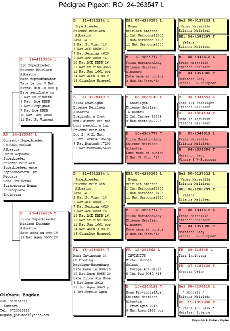 His achievements in competitions reflect a professional and consistent vision. Over the years, the breeder from Siminicea has achieved multiple Top 10 National rankings in the Marathon and Long-Distance categories, won 1st place in Suceava County in races ranging from 800 to 1000 km, and recorded remarkable results in challenging international races held in Ukraine and Poland (for example, Krasnodon). His constant participation in the Burdujeni–Suceava Championship, one of the most competitive areas in the country, confirms the consistency and value of his flying line.