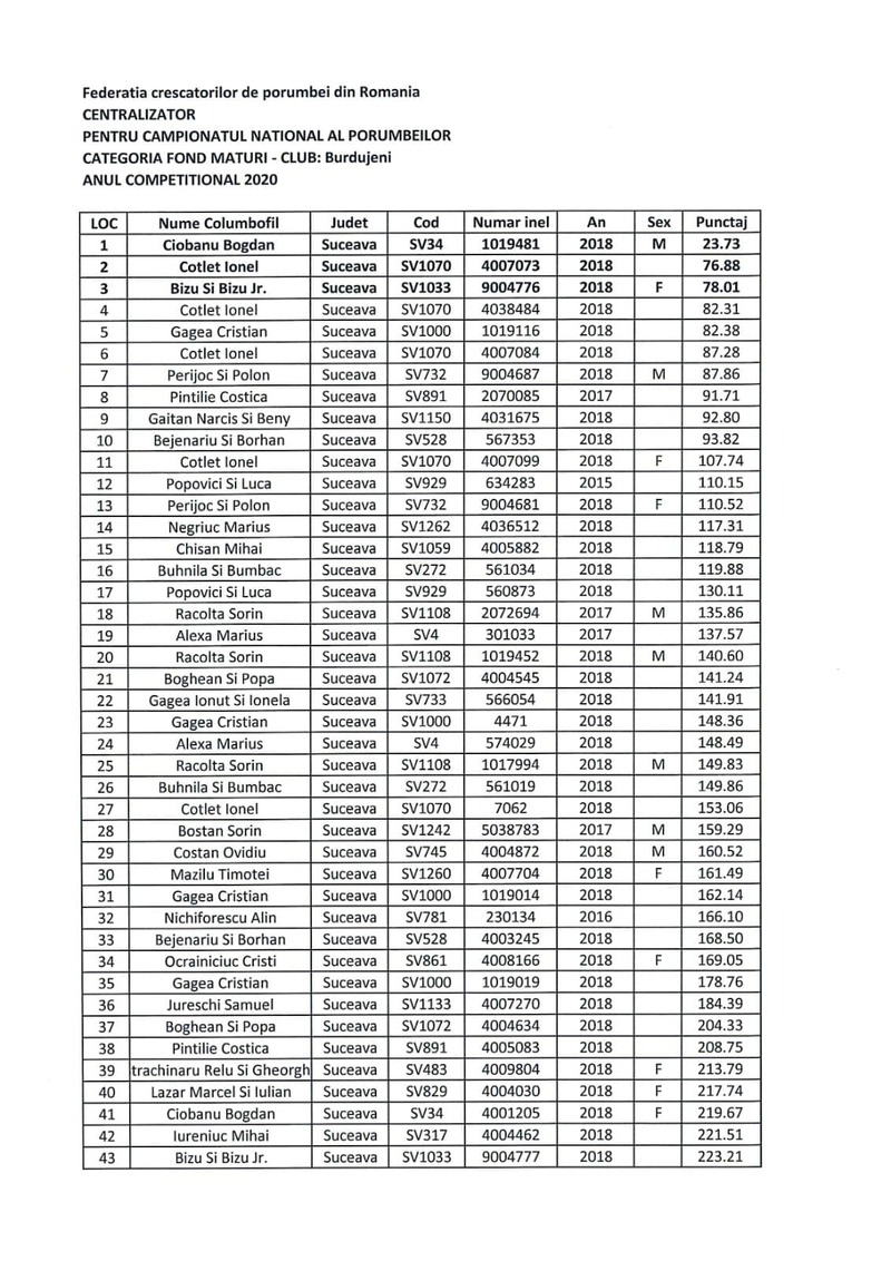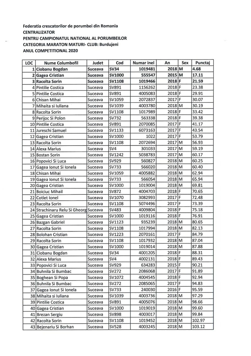 His achievements in competitions reflect a professional and consistent vision. Over the years, the breeder from Siminicea has achieved multiple Top 10 National rankings in the Marathon and Long-Distance categories, won 1st place in Suceava County in races ranging from 800 to 1000 km, and recorded remarkable results in challenging international races held in Ukraine and Poland (for example, Krasnodon). His constant participation in the Burdujeni–Suceava Championship, one of the most competitive areas in the country, confirms the consistency and value of his flying line.