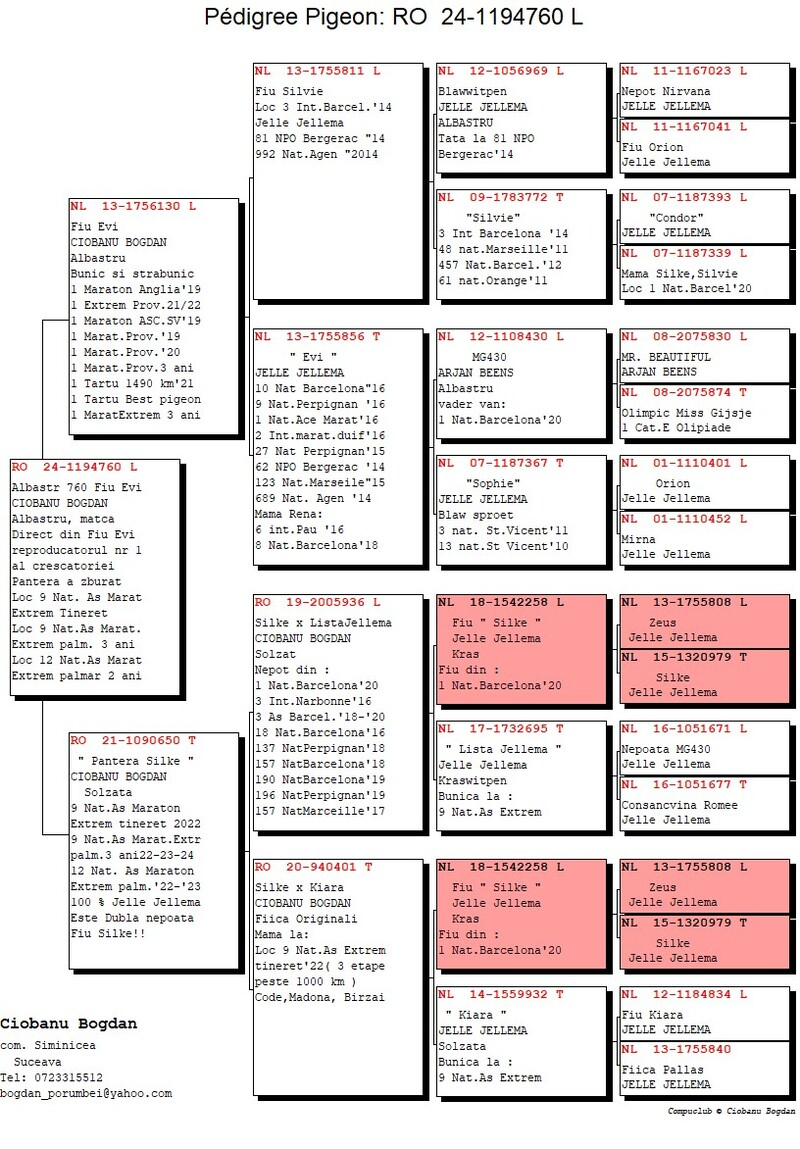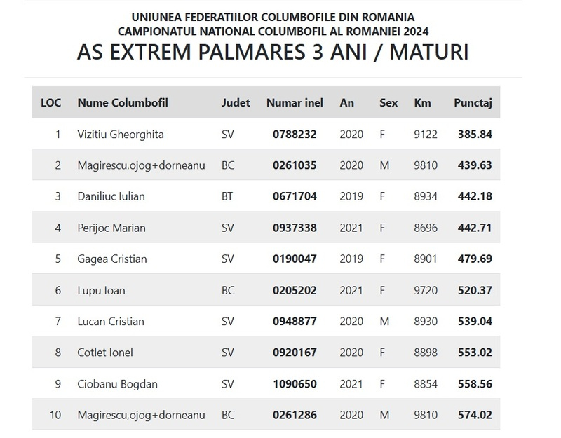 His achievements in competitions reflect a professional and consistent vision. Over the years, the breeder from Siminicea has achieved multiple Top 10 National rankings in the Marathon and Long-Distance categories, won 1st place in Suceava County in races ranging from 800 to 1000 km, and recorded remarkable results in challenging international races held in Ukraine and Poland (for example, Krasnodon). His constant participation in the Burdujeni–Suceava Championship, one of the most competitive areas in the country, confirms the consistency and value of his flying line.