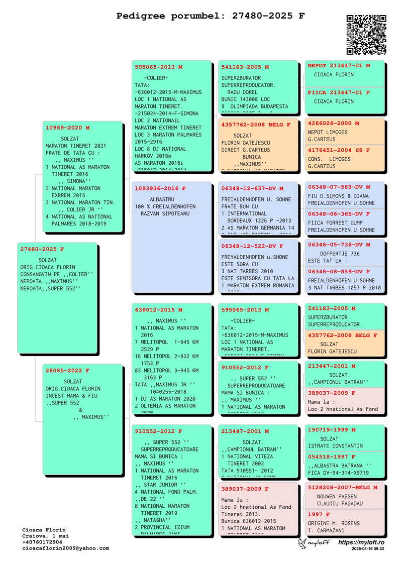 Throughout his career, Cioacă Florin has achieved an impressive series of titles and top rankings, both individually and as a breeder. Among his accomplishments are his participation in the National Olympic Team (Category E Marathon, 2014) and his 9th place at the Pigeon Olympiad in Budapest (2015) – results that place him among the world’s pigeon racing elite. Furthermore, numerous titles such as National Marathon Palmares, National Youth Fund, and National Ace Marathon, along with consistent Top 10 National placements, confirm the consistency and quality of his racing line.