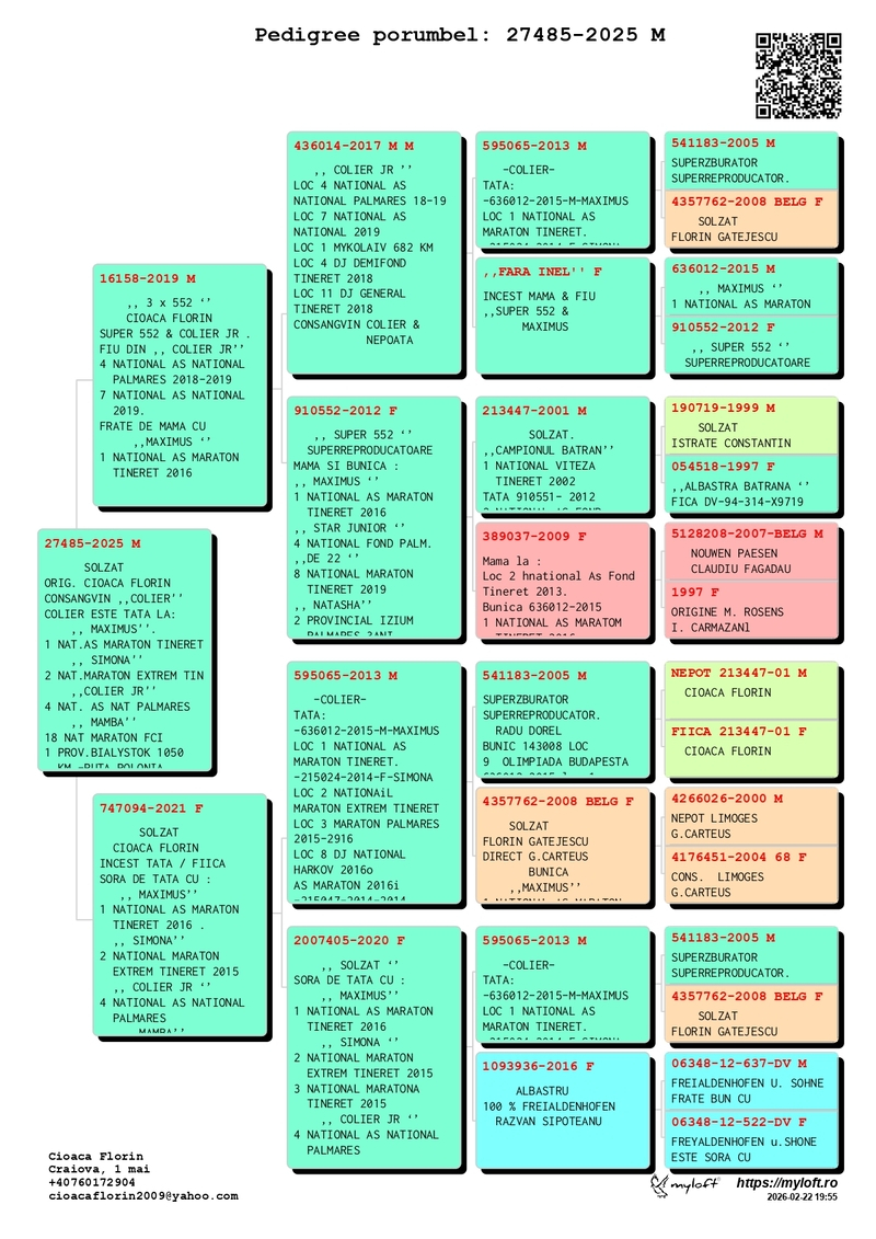 Throughout his career, Cioacă Florin has achieved an impressive series of titles and top rankings, both individually and as a breeder. Among his accomplishments are his participation in the National Olympic Team (Category E Marathon, 2014) and his 9th place at the Pigeon Olympiad in Budapest (2015) – results that place him among the world’s pigeon racing elite. Furthermore, numerous titles such as National Marathon Palmares, National Youth Fund, and National Ace Marathon, along with consistent Top 10 National placements, confirm the consistency and quality of his racing line.