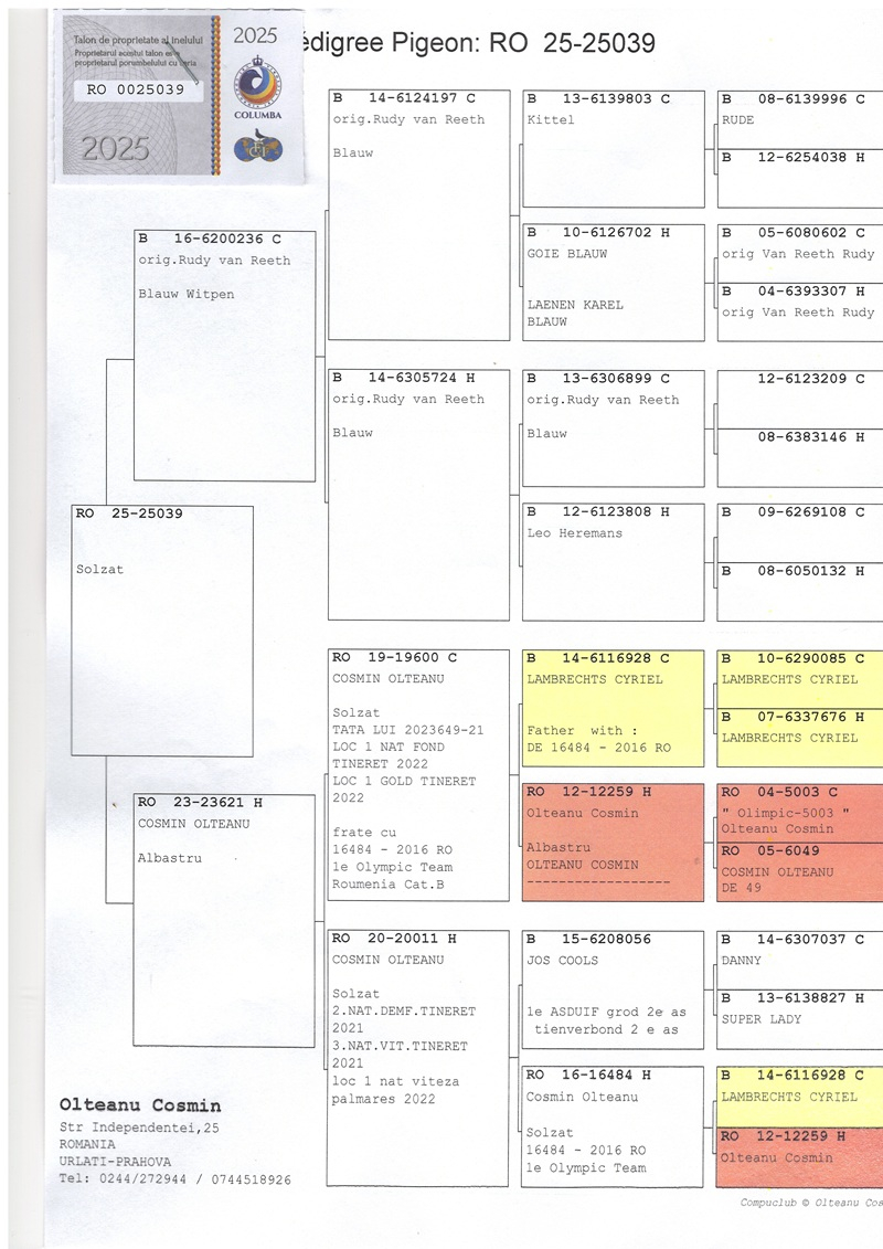 The origins of these remarkable performances are no coincidence: the champion hen descends from a Rudy Van Reeth cock and a Jos Cools hen, while the vice-champion was bred from a Jos Cools cock and the famous 484 hen, an Olympic pigeon from Olteanu’s own loft.
