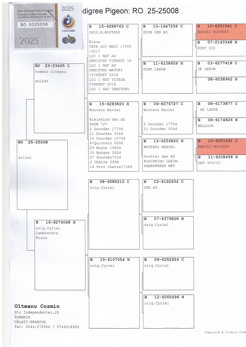 The origins of these remarkable performances are no coincidence: the champion hen descends from a Rudy Van Reeth cock and a Jos Cools hen, while the vice-champion was bred from a Jos Cools cock and the famous 484 hen, an Olympic pigeon from Olteanu’s own loft.