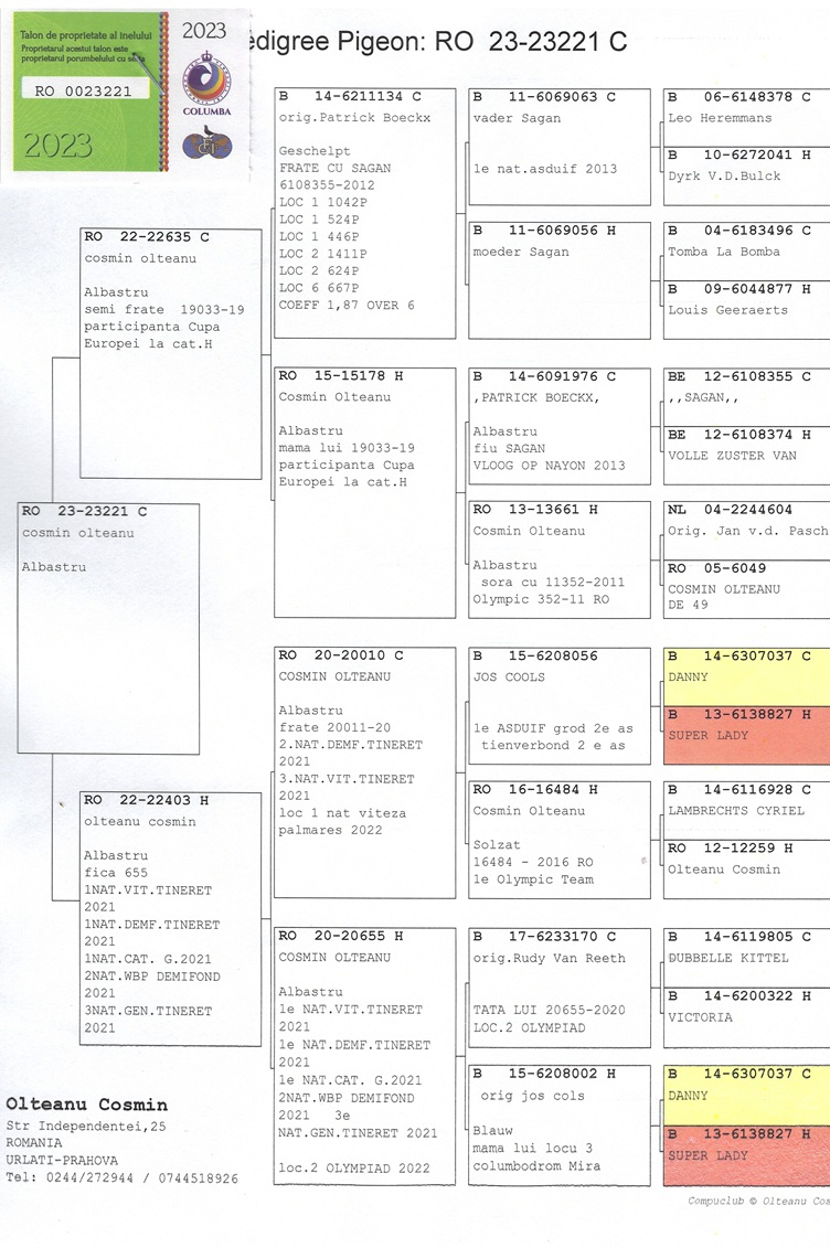 The origins of these remarkable performances are no coincidence: the champion hen descends from a Rudy Van Reeth cock and a Jos Cools hen, while the vice-champion was bred from a Jos Cools cock and the famous 484 hen, an Olympic pigeon from Olteanu’s own loft.