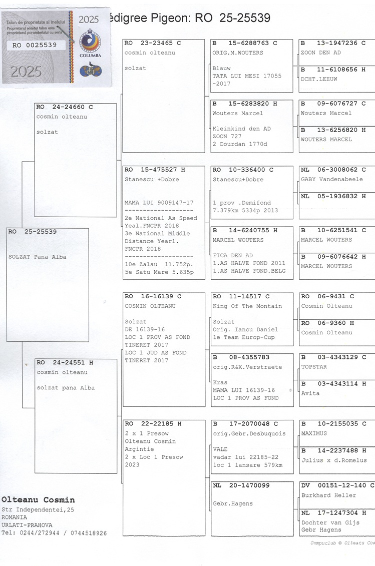 The origins of these remarkable performances are no coincidence: the champion hen descends from a Rudy Van Reeth cock and a Jos Cools hen, while the vice-champion was bred from a Jos Cools cock and the famous 484 hen, an Olympic pigeon from Olteanu’s own loft.