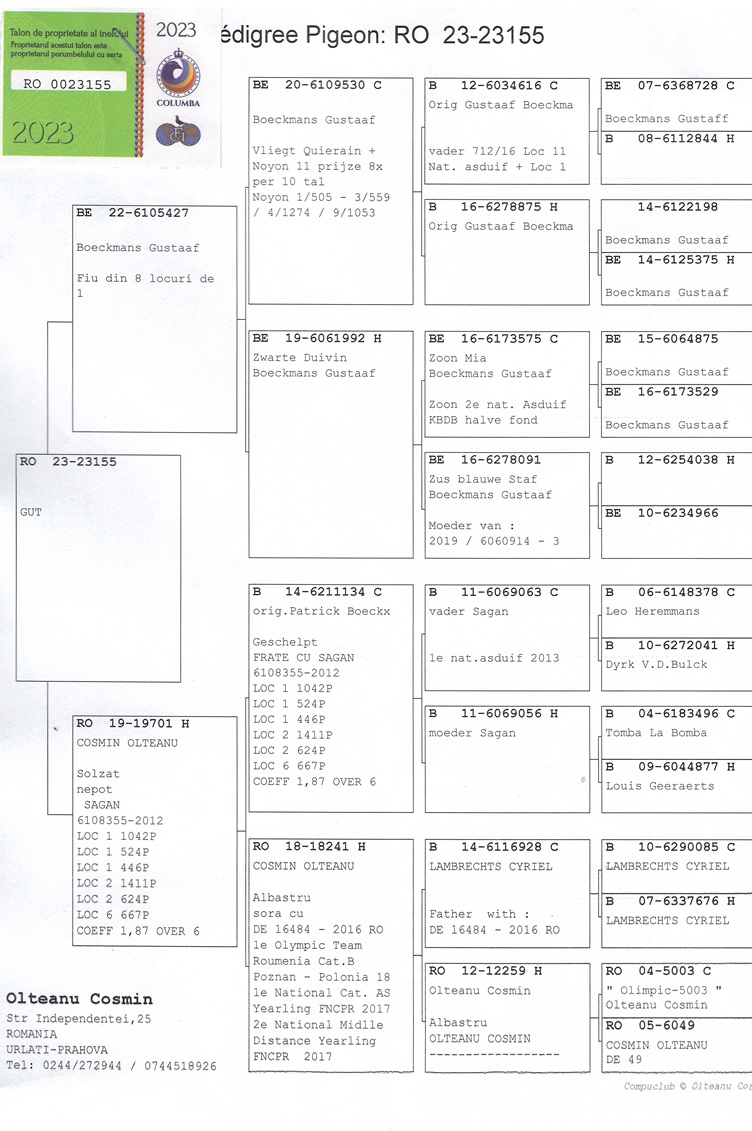 The origins of these remarkable performances are no coincidence: the champion hen descends from a Rudy Van Reeth cock and a Jos Cools hen, while the vice-champion was bred from a Jos Cools cock and the famous 484 hen, an Olympic pigeon from Olteanu’s own loft.